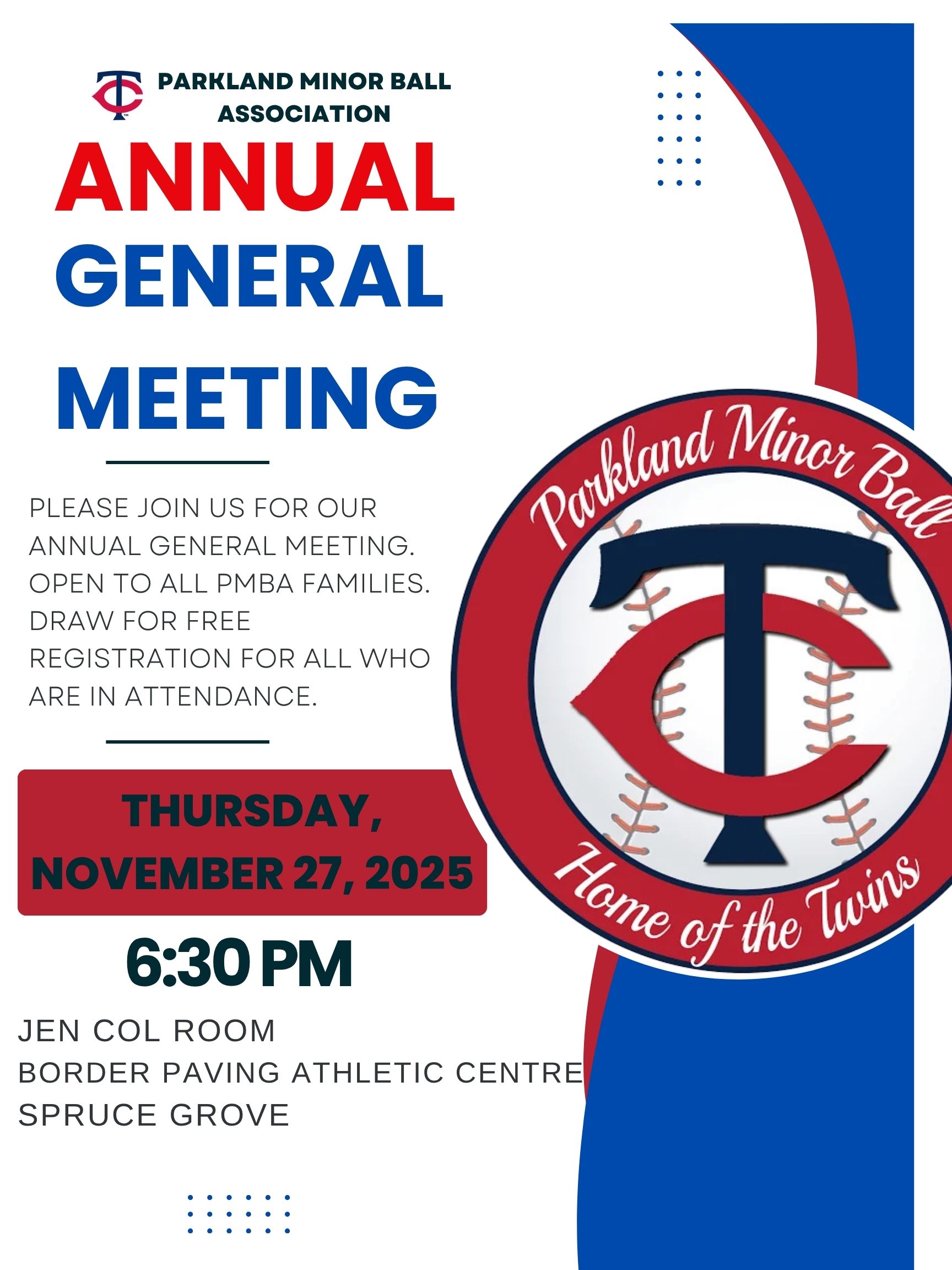 Parkland Minor Ball AGMPlease attend our 2025 Annual General Meeting. Open to all PMBA families. Draw for free registration for all who are in attendance. When: Thursday, November 27, 2025 6:30pm Where: Jen Col Room Border Paving Centre Spruce Grove PMBA OFF-SEASON TRAINING AFTER SCHOOL ACADEMY After School Academy programming will start at the beginning of November, information and link to register for this program can be found here: https://parklandminorball.ca/parkland-after-school-academy/ PMBA WINTER CAMPS Winter Camps will begin at the start of January, information and link to register for this program can be found here: https://parklandminorball.ca/winter-camp/ QUICK LINKS REGISTRATION COACHES WEATHER POLICY MANDATORY VOLUNTEERING FIELD/CAGE BOOKING TWINS ACADEMY RALLY CAP (ages 4-7) CHALLENGER PMBA APPAREL SOCIAL MEDIA Tweets by @parkland_twins THANK YOU TO OUR SPONSORS